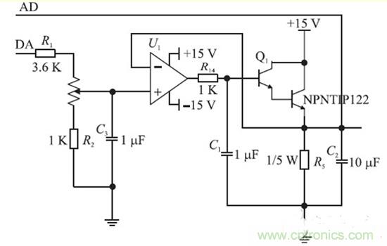 恒流源電路原理結構圖如圖2 所示,由于D/ A轉換輸出的模擬信號不穩定,加上C3 穩定電壓。經過3.6 K 的電阻和1 K 的電位器加到單運放OP07 的同相輸入端,調節電位器的阻值的大小可調節同相輸入端的電位,從而改變輸出點的電位,輸出電位加到達林頓管的B 管腳上,進入達林頓信號產生自激信號,通過C1過濾掉。利用達林頓管的電流放大特性,可實現大電流的輸出,電流放大倍數為1 000 ~15 000倍。