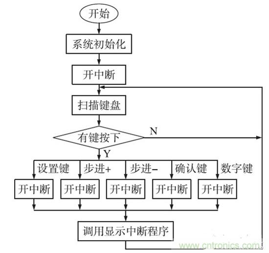 采用數字控制策略比模擬控制的有無可比擬的優勢:實現不同的控制算法;數字PID 具有設計周期短,調試和升級方便。數字控制系統主程序圖如圖6 所示。在系統加電后,主程序首先完成系統初始化,其中包括A/ D、D/ A、串行口、中斷、定時/ 計數器等工作狀態的設定,給系統變量賦初值,顯示上次設定值等。然后掃描獲取鍵值,判斷設定鍵、校準鍵是否按下,執行相應的功能子程序。當啟動鍵按下后,根據設定值、校正等參數計算對應輸出的數字量,再進行閉環反饋調整,如圖6 所示。