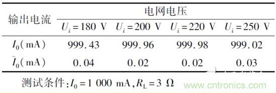 負載穩定性測試條件為U0 =220 V/50 Hz,I0 =1000 mA,測試數據如表2 所示,其中負載穩定度是指一定的工作情況下,負載變化引起的輸出電流變化。測試數據表明負載在0 ~10 贅變化時,輸出電流最大偏差為0. 99 mA,紋波電流小于0. 05 mA.