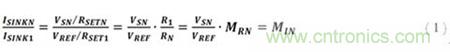 最終MOSFET(金氧半場效晶體管)源電壓VS以及RSET電阻決定著各柱上的灌電流(sink current);通過去除來自外部電流沉柱的反饋(即所有N》1),已失去對VSN的直接控制。因此,RSETN必須精心選擇以生成預期的任意第N個柱的灌電流,即ISINKN。仔細觀察上面的圖1,很容易得出定義偏置網絡第N個柱電流與第1個柱電流的比值的等式︰