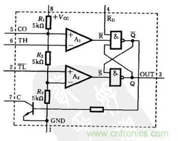 【導讀】首先介紹下555的內部電路電路結構,如下,其中,三極管起控制作用,A1為反向比較器,A2為同向比較器,比較器的基準電壓由電源電壓+Vcc及內部電阻的分壓比決定。RS觸發器具有復位控制功能,可控制三極管的導通與截止。