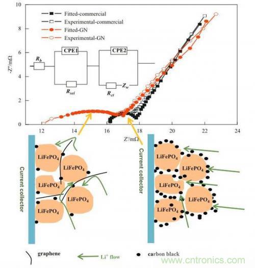 EIS分析顯示,添加石墨烯的實驗組電池的歐姆阻抗要明顯低于對照組電池,這主要得益于石墨烯的片狀結構能夠于活性物質顆粒形成很好的接觸,降低接觸電阻,但是在高頻段的電荷交換阻抗,實驗組電池要明顯高于對照組電池,這表明石墨烯的加入影響了Li+在電極內的擴散。仿真結果顯示,主要是由于石墨烯的片狀結構對Li+的擴散形成了阻礙,導致Li+的擴撒路徑延長,從而造成了添加石墨烯的鋰離子電池在大電流下極化增加,導致電池的放電容量下降。而傳統的炭黑、導電碳纖維和導電石墨等材料,由于橫截面較小,因此對Li+的擴散阻礙較小,對鋰離子電池大電流放電性能影響不大。