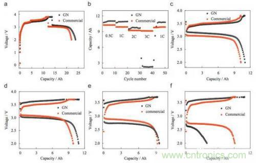 在隨后的倍率實驗中發現,在0.5C、1C和2C的充放電倍率下,實驗組的石墨烯導電劑電池相比于對照組電池都表出了更高的容量和更小的極化,但是當充放電倍率提高到3C時,實驗組電池容量迅速下降到4Ah以下,而對照組電池的容量仍然保持在9Ah左右,繼續將放電倍率提高到4C,實驗組石墨烯導電劑電池由于極化太大,已經無法放電,而對照組電池則相對穩定。