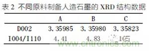 圖4是不同原料、相同制備工藝制成的三種人造石墨A、B、C的XRD圖譜,由圖4可知:A、B、C三種材料的主峰位置基本相同,均位于26°2θ角附近,說(shuō)明經(jīng)過高溫石墨化處理后的A、B、C三種材料形成了石墨晶體的六方晶型結(jié)構(gòu)。