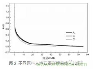 在扣電體系下,對(duì)電極為金屬鋰,放電工步對(duì)應(yīng)的是嵌鋰工步。圖5為不同原料人造石墨的在大電流(2C)下的嵌鋰曲線圖。從曲線圖上可以看出:A的嵌鋰平臺(tái)最高。由XRD數(shù)據(jù)可知A的各項(xiàng)同性性能較好。