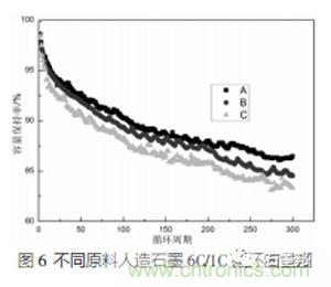 圖6為不同原料人造石墨倍率循環(huán)曲線圖。在6C/1C測(cè)試條件下,A材料的300周容量保持率為86.45%,倍率循環(huán)性能表現(xiàn)最好。