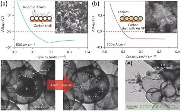 c-e)鋰沉積(c)、原位電子束加熱(d)后具有Au NPs的納米膠囊,鋰沉積后沒(méi)有Au NPs的碳?xì)ぃ╡)的TEM圖像。