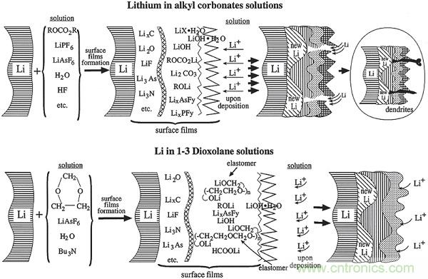 通常,本征SEI層由各種有機(jī)物(低聚物和聚合物)和無(wú)機(jī)物組成,其中有機(jī)部分賦予SEI層柔性以適應(yīng)鋰沉積,而無(wú)機(jī)部分能夠?qū)崿F(xiàn)快速的鋰離子傳輸。然而,無(wú)機(jī)碳酸鋰(Li2CO3)和鋰乙烯碳酸氫鈉(LEDC)作為兩個(gè)主要的SEI組分,在鋰沉積電位附近是熱力學(xué)不穩(wěn)定的,并且允許循環(huán)中反應(yīng)發(fā)生,而氧化鋰(Li2O)是唯一的熱力學(xué)和動(dòng)力學(xué)穩(wěn)定的組分,最里面的SEI層中的Li2O薄層是非常重要的,以避免在沒(méi)有氟化物源的情況下破裂。此外,化學(xué)和物理各向異性在SEI層內(nèi)是常見(jiàn)的,同時(shí)導(dǎo)致異質(zhì)鋰通量和不均勻沉積。沉積和溶解時(shí),由無(wú)機(jī)離子香料組成的表面不能適應(yīng)形態(tài)變化,因此可能會(huì)分解,導(dǎo)致高度不均勻的鋰沉積,使得枝晶形成。迄今為止,選擇合適的溶劑、鋰鹽和添加劑可以有效和高效地調(diào)節(jié)SEI層的性質(zhì)。