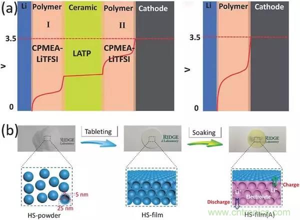 a)聚合物/陶瓷/聚合物-三明治電解質(zhì)(左),內(nèi)部曲線是固體混合電解質(zhì)和單個(gè)固體聚合物電解質(zhì)的電勢(shì)分布圖(右);