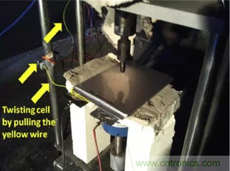 目前能夠模擬鋰離子電池內短路的方式有多種,例如針刺測試,小壓痕測試,BAJ測試和機械擠壓測試等,通過對大尺寸方形電池特點的分析,Hsin Wang認為機械擠壓測試最適合應用方形鋰離子電池的測試上。但是在傳統的擠壓的測試中由于電池受到的破壞太大,幾乎所有的電池都會發生熱失控,因此傳統的擠壓測試對不同種類電池安全性的“分辨率”就很低,只有通過和不通過兩種結果,只能對鋰離子電池的安全性進行定性分析。可能兩個電池都沒有通過安全性測試,但是A電池的安全性卻要好于B電池,為了能夠準確的評估不同體系電池的安全性能,Hsin Wang對傳統的擠壓實驗進行了改進,通過在電池負極極耳上施加一個拉力,讓電池產生大約5°的扭曲,從而減少在擠壓過程中電池受到的破壞,因此該實驗能夠準確的評估不同種類電池的的安全性高低。