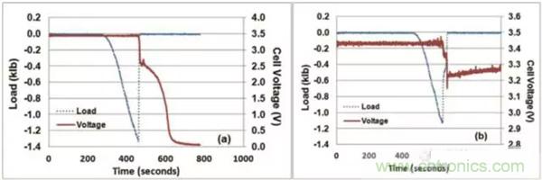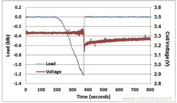 為了方便讀者理解本文,下圖是給出了LFP電池一個非常典型的成功通過機械擠壓測試(正反饋)的判據,電池擠壓變形達到一定的程度后,引起了電池內短路的發生,電池電壓迅速下降,檢測到電壓下降后(0.1V),擠壓力隨之被移除,電池的電壓快速回升,電池沒有發生熱失控,則電池通過擠壓實驗。