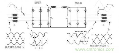 由于晶閘管只能接通,不能斷開,因此交流電壓會(huì)使晶閘管發(fā)生反向偏置并停止傳導(dǎo)。因此,LCC中的晶閘管的偏置取決于電網(wǎng)AC側(cè)用于換流的功率。在晶閘管正向偏置后導(dǎo)通時(shí)的延時(shí)決定了相位角延遲(觸發(fā)角)。晶閘管的相位角延遲實(shí)現(xiàn)了交流波的相位角控制。