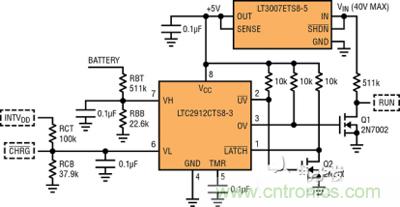 用 LTC2912-3 實現之前介紹的大部分功能。這款具閉鎖控制的電壓監視器在圖 2 所示電原理圖的中央。