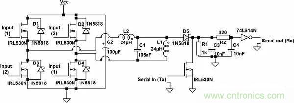 現(xiàn)在雙向輸電電路可以基于LCL逆變器來(lái)構(gòu)建,其中,兩個(gè)反相方波分別輸入到四MOSFET逆變器的1號(hào)和2號(hào)輸入端,見(jiàn)圖4。
