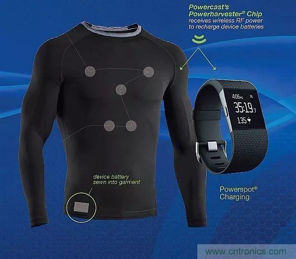 可穿戴設(shè)備設(shè)計(jì)人員可以將Powercast公司的Powerharvester IC嵌入到可穿戴設(shè)備中,為一個(gè)或多個(gè)設(shè)備提供一定距離的無(wú)線充電。通過(guò)收集ISM頻段的射頻能量,這種IC可以向可穿戴設(shè)備的電池提供涓流充電。這種方法支持可水洗的密封設(shè)備。