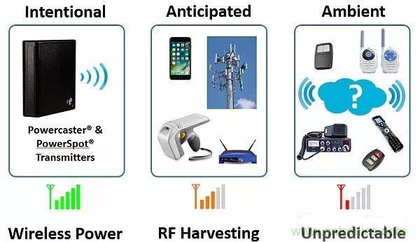 在壁櫥或梳妝臺(tái)抽屜中可以安裝類(lèi)似手機(jī)發(fā)射器的小功率射頻發(fā)射器。這種發(fā)射器可以為可穿戴服裝提供充電區(qū)域。不管可穿戴設(shè)備是在壁櫥里還是在抽屜里,這些設(shè)備的電池都能自動(dòng)接收涓流充電。這種方法與接收器需要依賴一定頻率范圍內(nèi)的隨機(jī)射頻信號(hào)的場(chǎng)景不相干。圖9給出了射頻電源種類(lèi)。