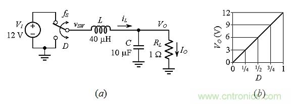 圖1:(a)降壓轉(zhuǎn)換原理(fS和D表示開(kāi)關(guān)切換的頻率和占空比);(b)VO是D的函數(shù)。