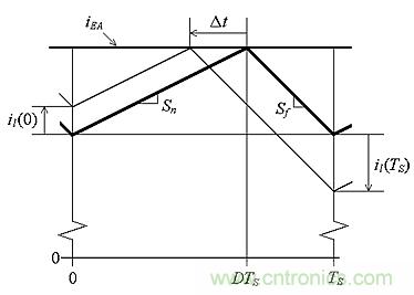 這樣,我們僅以電流形式就可以顯示一個(gè)周期,如圖4所示?,F(xiàn)在,復(fù)位觸發(fā)器打開(kāi)Mp開(kāi)關(guān),同時(shí)關(guān)閉Mn開(kāi)關(guān),使vSW= 0。在表示為(1–D)TS的周期其余部分,我們有vL=0–VO,所以iL以Sf的斜率下降,因此有: