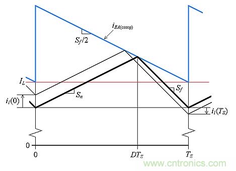 第二個(gè)缺陷是稱為次諧波振蕩的不穩(wěn)定形式,當(dāng)D>0.5時(shí)會(huì)產(chǎn)生這種不穩(wěn)定。圖6顯示了周期開(kāi)始時(shí)電感電流擾動(dòng)il(0)如何在周期結(jié)束時(shí)演化為擾動(dòng)il(TS)。例如,擾動(dòng)可能由前一周期中比較器失能引起。借助簡(jiǎn)單的幾何,我們可以得出il(0)/△t = Sn和il(TS)/△t = Sf。消除△t,得出: