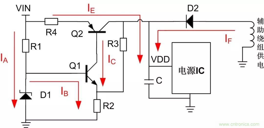 輸入電壓VIN為NPN三極管Q1提供IB電流使用它處于放大區(qū),IC為放大電流也為PNP三極管Q2的基極電流,通過對IC電流的控制,可使Q2處于飽和狀態(tài)并以IE的飽和電流向電容C充電,直到Q2處于半截止或半飽和狀態(tài)。此時,電容就等效成一個恒流源為IC芯片提供能量,當電容電壓降到一定值時,啟動電路繼續(xù)為電容充電,直到輔助供電有電壓后,才通過電阻R2、R3之間的分壓使Q1處于截止狀態(tài),此時啟動電路才停止工作,之后芯片的供電完全由輔助繞組提供。