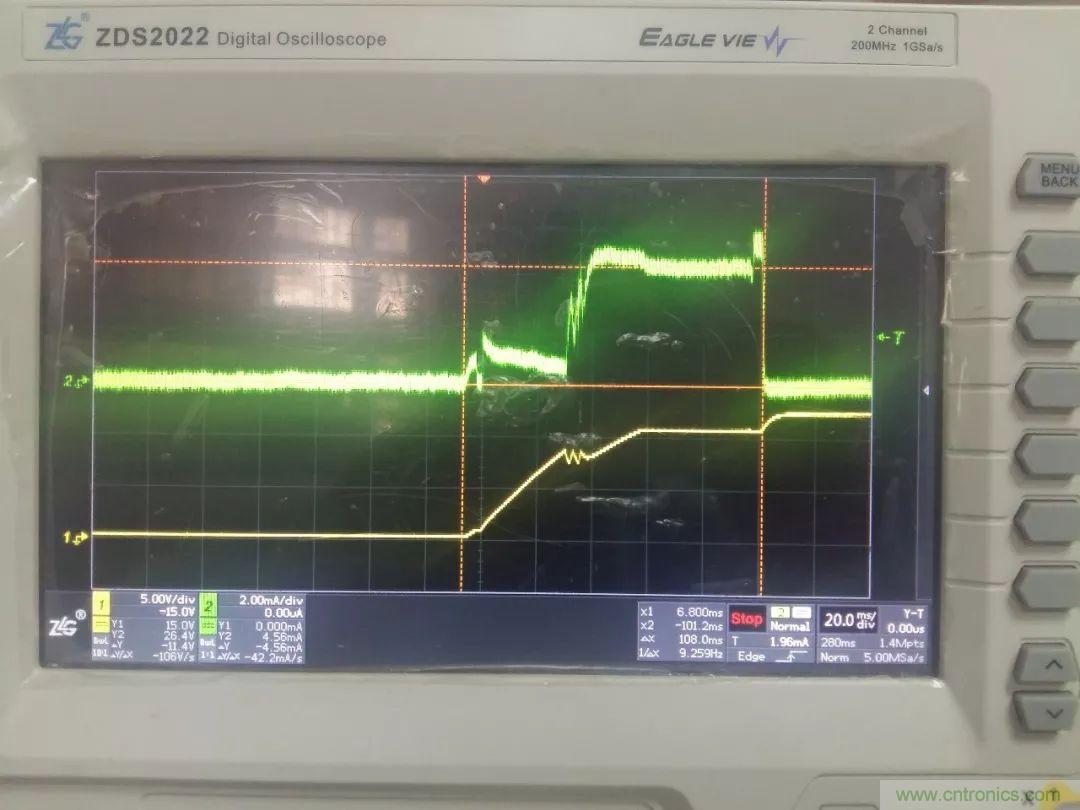 如下圖3所示,為圖2電路的實驗波形圖,綠色為IE電流波形,黃色為VDD電壓波形(示波器采用zlgZDS2022)。從圖中可看出開關電源啟動可分三個階段,第一階段,在上電時IE以近似1mA的電流向電容C充電,當VDD電壓達到UCC28C40門限電壓時進入第二階段,此時飽和電流增加至5mA,在為IC供電的同時繼續(xù)為電容充電,當輸出電壓建立后進入第三階段,此時IE電流為零,啟動電路停止工作,VDD電壓上升至輔助繞組電壓。在啟動的整個過程中,IE的電流都是比較小而且比較平緩,所以該電路安全可靠。