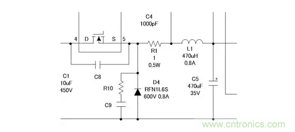 電感L1如電路圖所示,由輸出電容器C5和LC濾波器共同組成。L1電感值的設置要使設備在不連續模式下工作。這是因為如果以連續模式工作,二極管的反向恢復時間、trr間的反向電流會導致二極管的損耗増加,而且該反向電流還會成為MOSFET導通時的峰值電流,因此MOSFET的損耗也會増加。為了避免這種問題而選擇不連續模式。