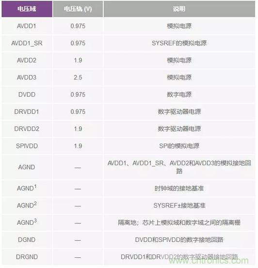 為了改善隔離,設計者必須考慮各種耦合機制。最明顯的機制是通過共享電源域。如果電源域盡可能遠離電路,那么共享同一電壓軌(AD9208為0.975 V)的數字電路和模擬電路發生震顫的可能性將非常小。在硅片中,電源已被分開,接地也是如此。封裝設計繼續貫徹了這種隔離電源域處理。由此所得的同一封裝內不同電源域和地的劃分,如表2所示,其以AD9208為例。