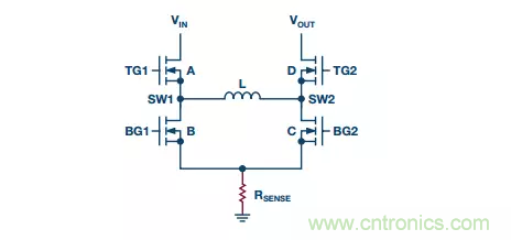 圖9電路解決了這個(gè)問(wèn)題,其將檢測(cè)電阻與電感串聯(lián),從而在降壓和升壓模式下均能連續(xù)測(cè)量電感電流信號(hào)。由于電流檢測(cè) RSENSE連接到具有高開(kāi)關(guān)噪聲的SW1節(jié)點(diǎn),因此需要精心設(shè)計(jì)控制器IC,使內(nèi)部電流比較器有足夠長(zhǎng)的消隱時(shí)間。
