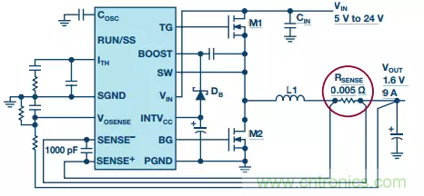 圖4中,檢測(cè)電阻位于底部MOSFET下方。在這種配置中,它檢測(cè)谷值模式電流。為了進(jìn)一步降低功率損耗并節(jié)省元件成本,底部FET RDS(ON)可用來(lái)檢測(cè)電流,而不必使用外部電流檢測(cè)電阻RSENSE。