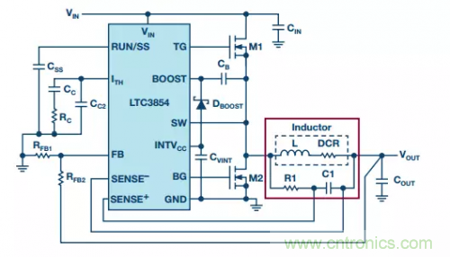 電路不直接測(cè)量電感電流,因此無(wú)法檢測(cè)電感飽和。推薦使用軟飽和的電感,如粉芯電感。與同等鐵芯電感相比,此類電感的磁芯損耗通常較高。與RSENSE方法相比,電感DCR檢測(cè)不存在檢測(cè)電阻的功率損耗,但可能會(huì)增加電感的磁芯損耗。
