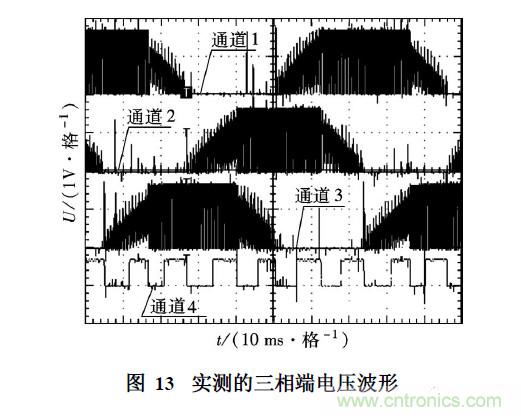 圖13為實(shí)測(cè)的三相端電壓波形(通道1~通道3) ,通道4的上升沿和下降沿分別對(duì)應(yīng)過零點(diǎn)和換相點(diǎn).