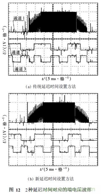 2種延遲時(shí)間設(shè)置方法對(duì)應(yīng)的實(shí)測(cè)端電壓波形(通道1)如圖12所示,通道2和通道3為過零點(diǎn)檢測(cè)波形,通道2的上升沿和下降沿對(duì)應(yīng)于過零點(diǎn),而通道3的上升沿和下降沿分別對(duì)應(yīng)過零點(diǎn)和換相點(diǎn).