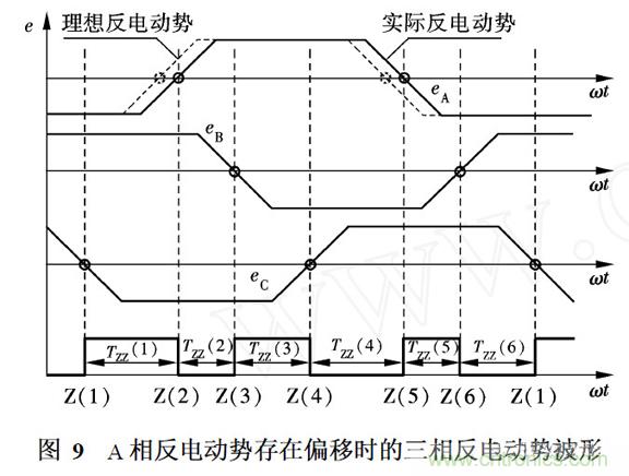 假設(shè)A 相反電動(dòng)勢(shì)存在相位偏移, 波形上升和下降部分上的過零點(diǎn)滯后出現(xiàn),導(dǎo)致過零點(diǎn)在時(shí)間軸上分布不均勻. 如圖9所示, 虛線表示理想反電動(dòng)勢(shì),實(shí)線表示存在相位偏移的實(shí)際反電動(dòng)勢(shì),過零點(diǎn)的間隔時(shí)間TZZ (1) , TZZ ( 2)和TZZ ( 3)不相等. 每相反電動(dòng)勢(shì)波形上升和下降部分的2個(gè)過零點(diǎn)相差180°電角度, 過零點(diǎn)間隔時(shí)間存在著周期性規(guī)律,如TZZ ( 1) =TZZ ( 4) , TZZ ( 2) = TZZ ( 5)和TZZ (3) = TZZ (6) .