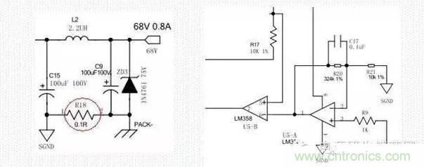 工作原理:R18為回路的電流檢測電阻,為了降低損耗,此電阻選擇時盡量的小。U5為運算放大器LM358,358內部由兩個運放,我們將兩個運放一個做放大器,一個做比較器,將檢測電阻上的電壓值放大32.4倍后與基準電壓做比較。當運放值低于基準值時,比較器輸出高電平(358VCC電壓),當運放值高于基準電壓值時,比較器輸出低電平(相對于接地).