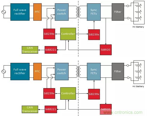 OBC系統(tǒng)采用交流輸入源,通過全波整流器將其轉(zhuǎn)換為高壓直流總線電壓,并提供功率因數(shù)校正(PFC)。產(chǎn)生的直流信號被斬波成開關方波,用于驅(qū)動變壓器以產(chǎn)生所需的直流輸出電壓。輸入信號的斬波由隔離柵極驅(qū)動器(例如Silicon Labs的Si8239x器件)完成。