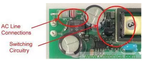 圖1是這些非計劃中電容的一個實例。圖中的右側(cè)是一個垂直安裝的FET,所帶的開關(guān)節(jié)點與鉗位電路延伸至了圖片的頂部。輸入連接從左側(cè)進入,到達距漏極連接1cm以內(nèi)的位置。這就是故障點,在這里FET的開關(guān)電壓波形可以繞過EMI濾波器耦合至輸入。