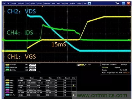 根據系統浪涌電流和di/dt的要求,使用上面公式就可以求出外加的電容CGS1,由此選取相應的標準電容值。不同的CGS1值可以改變過沖的峰值浪涌電流的大小。