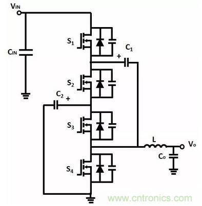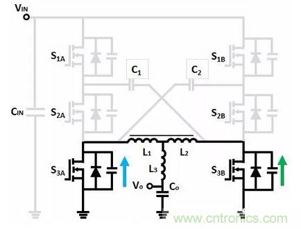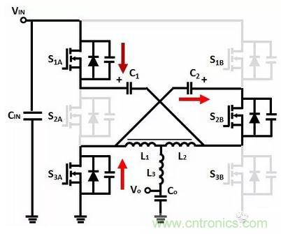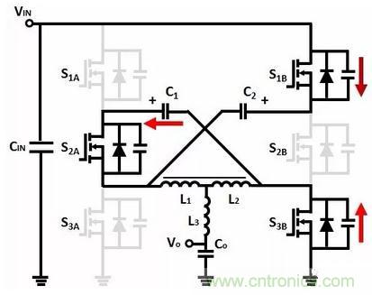 如果C1、C2的電容相等,電感電流等于電容C1、C2的電流之和。S1、S3工作于硬開關狀態,由于S1、S3的電流降低,因此可以同時降低導通損耗和開關損耗。