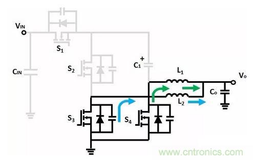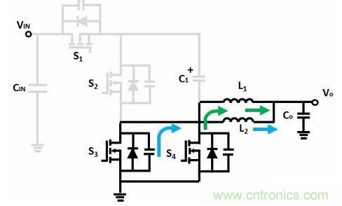 輸出電感去磁,在前面一個階段過程結束時,由于C1、C2的電壓不平衡,當S2、S4導通后,將C1、C2并聯,所以電壓高的電容將會對電壓低的電容放電,那么,S4不僅流過輸出電感續流電流,還要流過C1、C2充放電的電流,因此其導通損耗會增加。