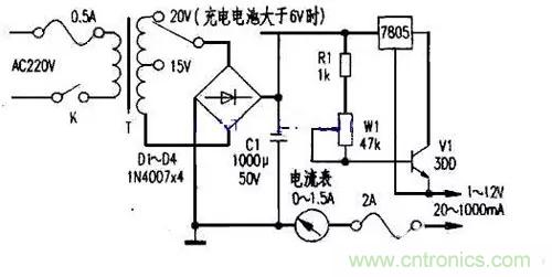 如圖所示,該電路由7805構(gòu)成恒流源電路,通過大功率三極管進行擴流。