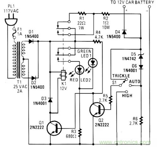 不管是一個低電流(50毫安),還是高電流(1安培),該電路都有能力提供。你可以選擇手動充電或者自動模式。當(dāng)電流很低的時候,你可以在選擇高電流充電之前先用低電流。如果電池的電壓過低,齊納二極管D5將有足夠的電流來產(chǎn)生一個穿過R6的電壓從而使得Q2開啟。