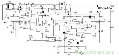 本電路設(shè)有反極性保護電路,由D4,U,U1D,T1及外圍元件構(gòu)成,當(dāng)電池反接時,充電器限制輸出電流不致發(fā)生事故。充電指示由U,D7及外圍元件構(gòu)成,充電時,D7點亮,充電器進入浮充狀態(tài)后,D7熄滅,表示充電結(jié)束。