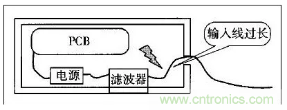 許多設備的電源線進入機箱后,經過很長的導線才接到濾波器的輸入端。例如,電源線從機箱后面板輸入,走行到前面板的電源開關,又回到后面板接到濾波器。或者濾波器的安裝位置距離電源線入口較遠,造成引線太長(如圖1所示)。
