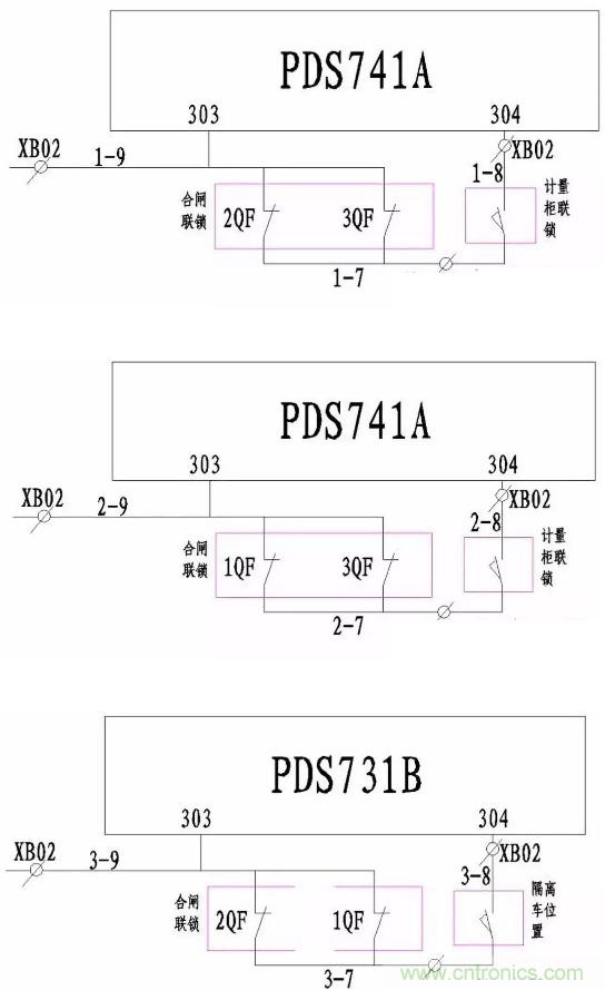 在計量柜與母聯隔離柜都到位的情況下,合1QF與2QF。這時PDS731B的3-7與3-9處于分斷的狀態,其304端子無電源,3QF不滿足合閘條件。同理,1QF與3QF合閘時,2QF不滿足合閘條件;2QF與3QF合閘時,1QF不滿足合閘條件。