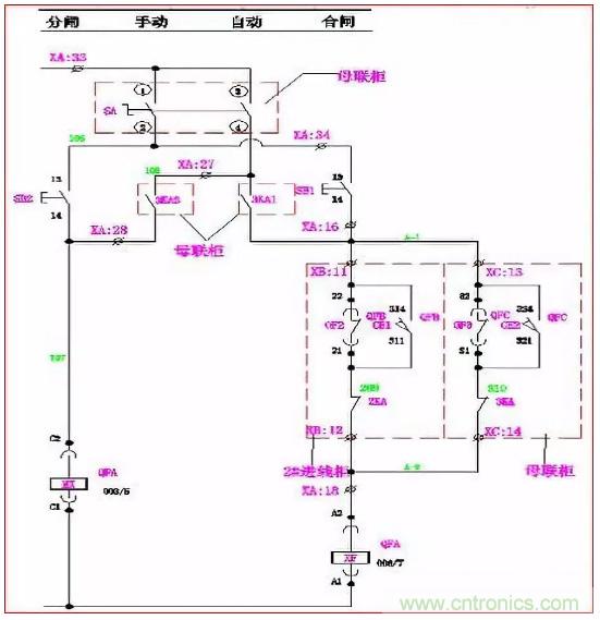 手動時:萬轉SA的1、2腳連通。當Q2、Q3合閘,Q1合閘回路A-2、A-3斷開,其合閘線圈XF無法得電, Q1不能滿足合閘條件;同理,當Q1、Q2或Q1、Q3同時合閘時,Q2或Q3也同樣不能滿足合閘條件。使進線柜與母聯滿足“三合二”邏輯。