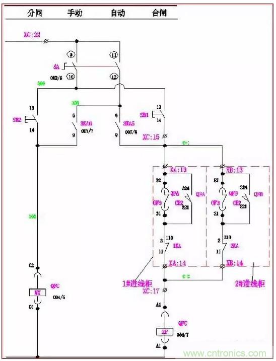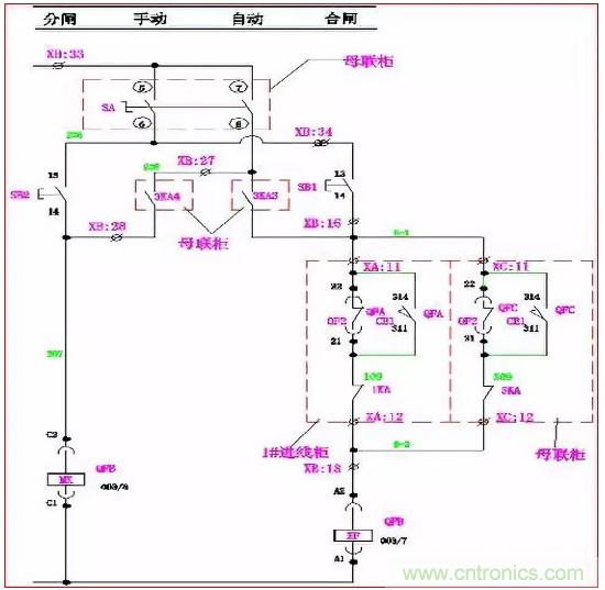 手動時:當QFA、QFB合閘,QFC合閘回路C-1、C-2斷開,其合閘線圈XF無法得電, QFC不能滿足合閘條件;同理,當QFA、QFC或QFB、QFC同時合閘時,QFB或QFA也同樣不能滿足合閘條件。使進線柜與母聯滿足“三合二”邏輯。