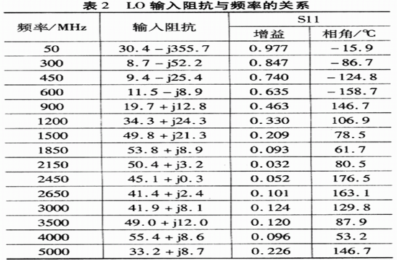 頻率大于1.2 GHz時,盡管放大器提供的功率有幾個dB,但最佳LD驅(qū)動功率只有-3 dBm(I/0輸入功率變化,混頻器性能不變);在頻率低于1.2GHz的情況下,盡管-3 dBm的L0驅(qū)動功率仍然提供高轉(zhuǎn)化增益和線性,但是為了得到最佳噪聲,LO驅(qū)動功率為0 dBm。自定義匹配網(wǎng)絡(luò)的阻抗數(shù)據(jù)見表2,并參考LO端沒有匹配時的情況。