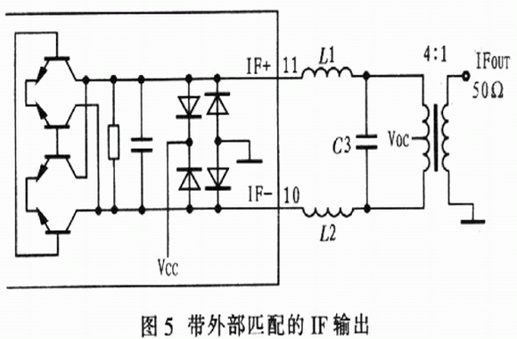 圖3示出由混合變壓器構(gòu)成的lF匹配電路,以達(dá)到最低LO-IF泄漏和最寬的IF帶寬。圖4示出由1個離散的IF不平衡變壓器代替IF變壓器的電路,以降低成本和縮小尺寸,盡管離散的IF不平衡變壓器也有較理想的噪聲系數(shù)、線性度及較高的轉(zhuǎn)換增益,但是LO-IF泄漏降低,IF的帶寬減小。