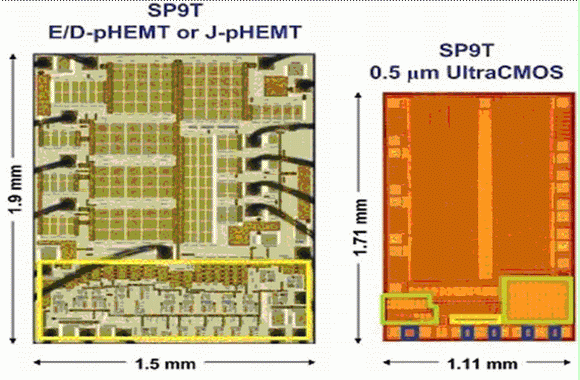 隨著多頻段手機越來越流行,對高集成度、小型天線開關的需求也越來越迫切。UltraCMOS SP7T開關現在已經開始批量生產,SP9T也在2007年底投入批量生產。在外形方面,GaAs SP7T為1.6x1.5mm,而采用SOS工藝SP7T開關只有1.2x1.0mm,面積縮小了一半。目前的GaAs E/D pHemt或J-pHemt SP9T開關外形尺寸為1.9x1.5mm。與之相比,采用UltraCMOS 0.5μm工藝制造的SP9T外形尺寸為1.7x1.1mm(圖3),它不需要片外ESD器件和性能增強匹配器件。UltraCMOS發展規劃預計0.25μm版本的SP9T尺寸將達到1.32x1.29mm。