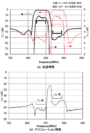 舉例來說,圖1所示的是BAND5(800MHz )收發(fā)雙工器(產(chǎn)品尺寸2.5×2.0×0.6mm)的傳輸特性以及隔離度。一般的隔離度和過濾性的損耗是相互制約的關(guān)系,但本產(chǎn)品對于Tx頻段能實(shí)現(xiàn)60dB的高隔離度,同時使Rx損耗維持在1.8dB。